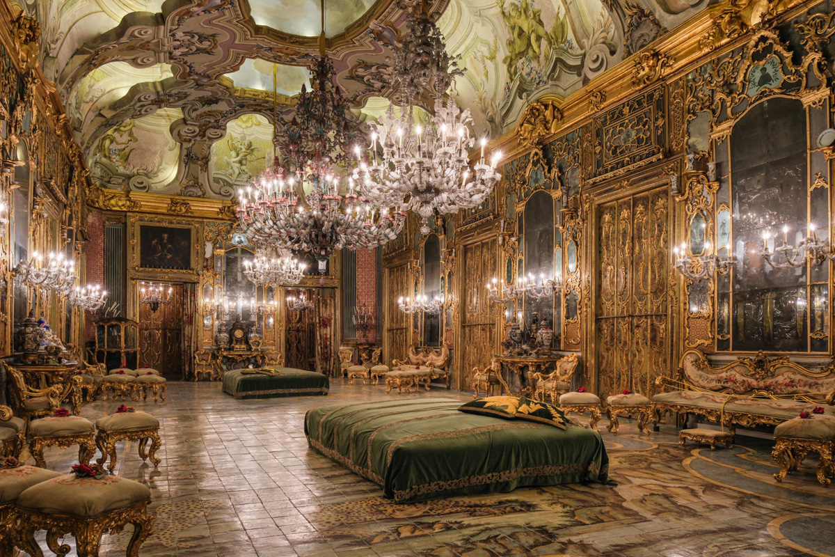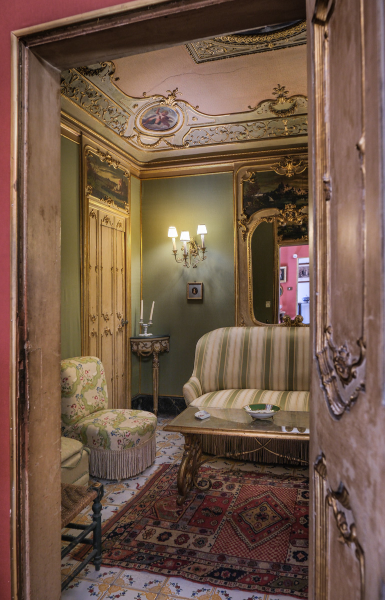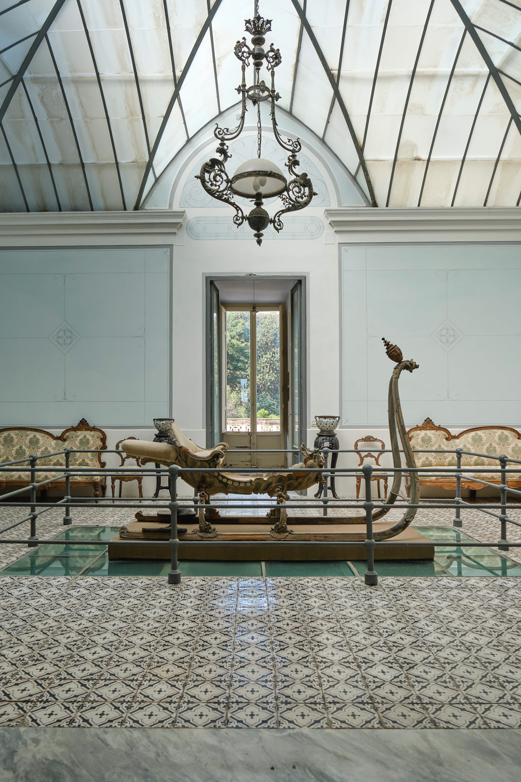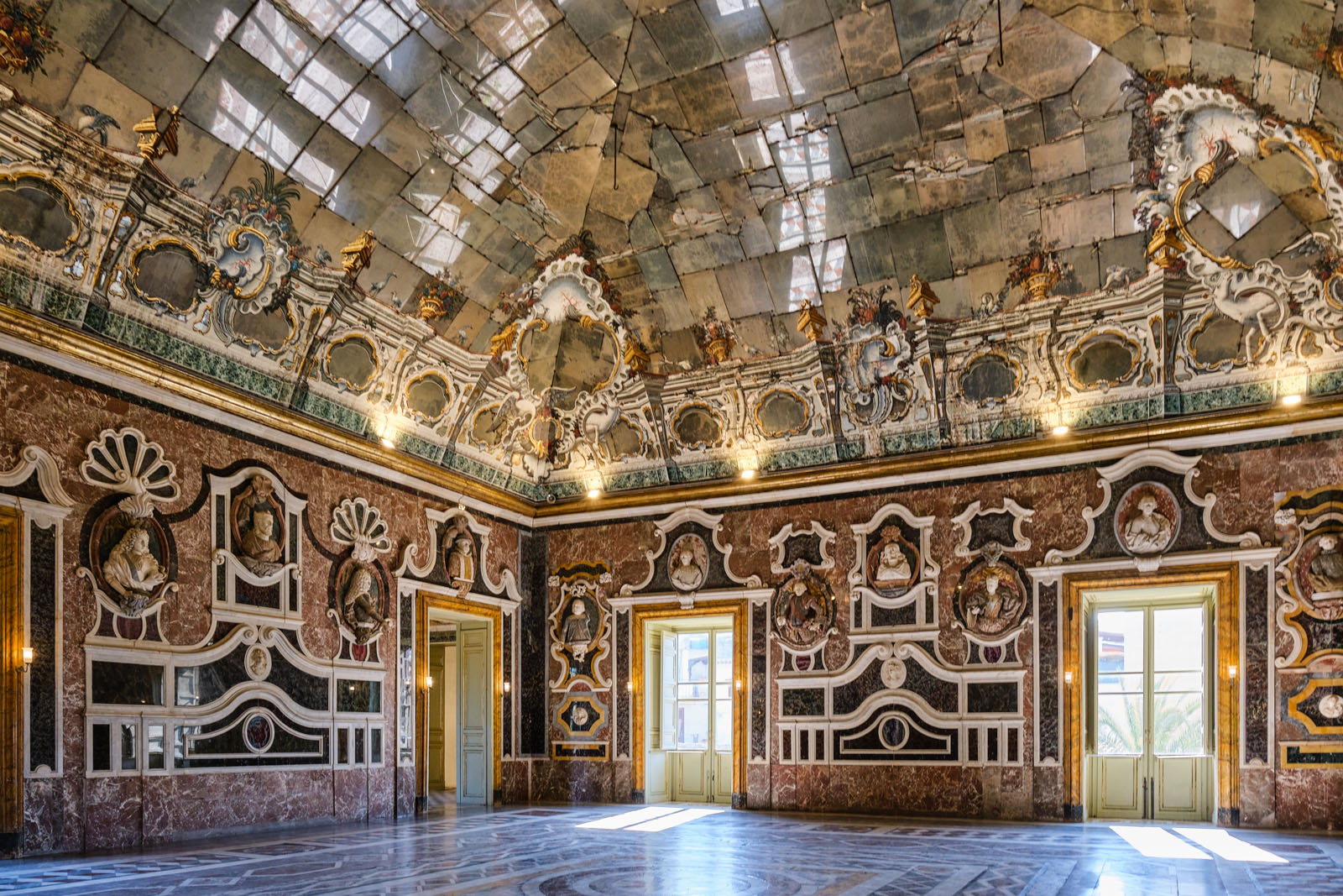 The heart and wonder of the Palace is the Gallery of Mirrors, closed by two boudoirs, with a unique ceiling 12 meters high and characterized by a double-height fretwork designed to emphasize the light of the candles of the large Murano glass chandeliers and a wonderful Vietri majolica floor decorated with the Labors of Hercules and the famous leopards.