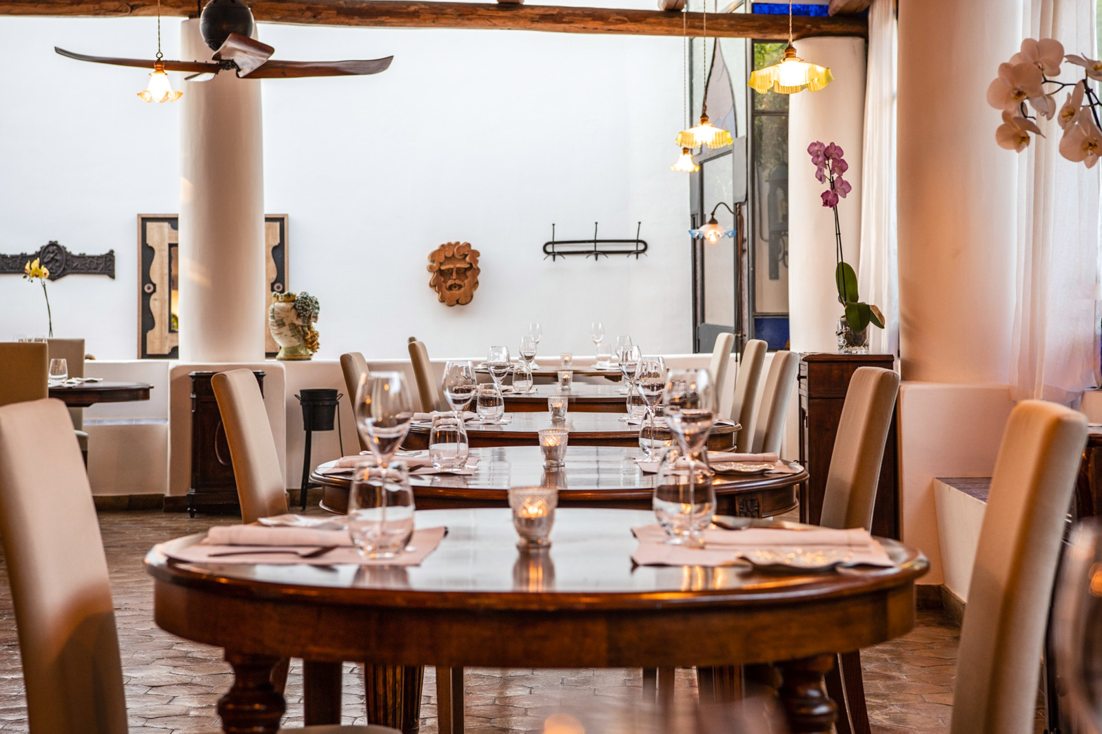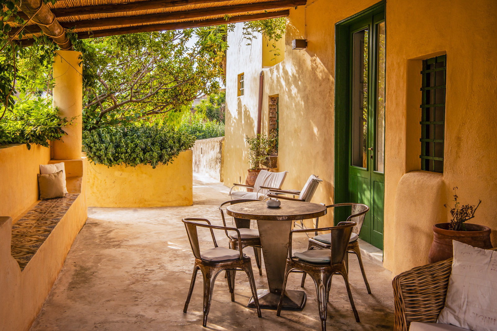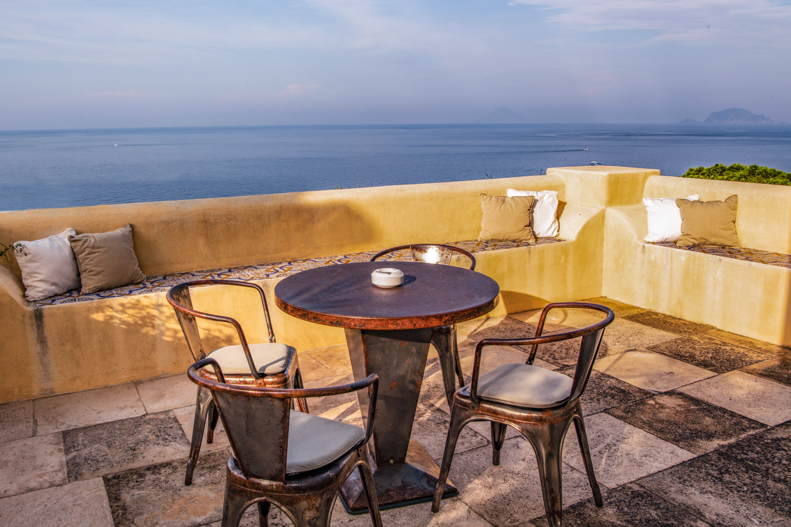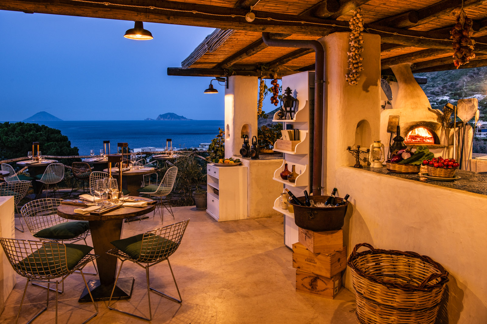 Una volta varcata la reception, si svela innanzi la bellissima terrazza che ospita il ristorante stellato, mentre a sinistra il salotto ospita il suggestivo bar interno, realizzato su un vecchio palmento, e la sala ristorante coperta, una veranda a vetri di cattedrale, con decori blu e gialli. Poco più avanti, un’altra terrazza panoramica accoglie il cocktail bar, il bistrot e la prima colazione con una vista meravigliosa su Panarea e Stromboli.